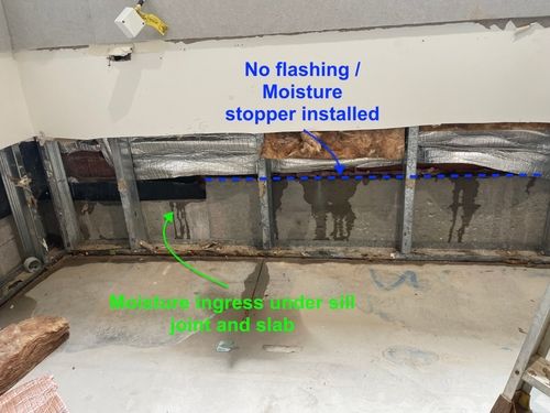 Even when cavity flashing is installed correctly, water ingress can still occur due to construction details, step-down slabs, or wall junctions that fail to discharge moisture effectively. In this project, we identified water entering office areas beneath joinery, highlighting the need for a detailed investigation and alternative remedial solutions beyond standard NCC specifications.